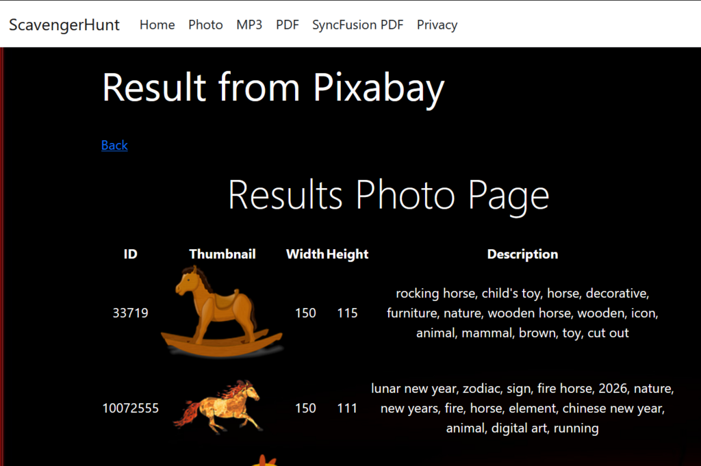 I just found one of my first attempts for creating the scavenger hunt app from May 2022. Back then I seem to not have fully switched to node.js/Svelte but instead I had this ASP.NET Core based approach which – surprisingly – still just built and started when I tried it out. And I could even retrieve some images via API calls to Pixabay, Unsplash and Pexels: